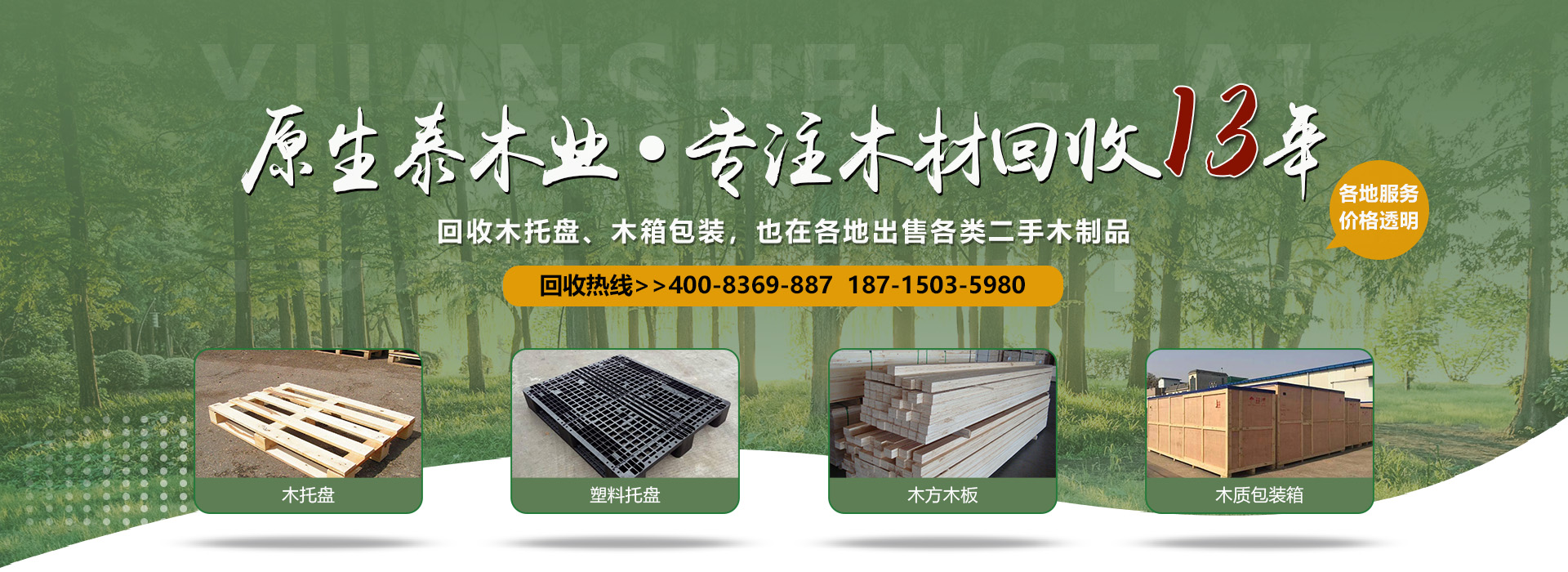 關(guān)于我們原生泰木業(yè)有限公司是一家服務(wù)各市的企業(yè),本公司是以回收各類(lèi)二手廢舊木材為主,主要回收各類(lèi)木托盤(pán)、塑料托盤(pán)、木箱包裝、建筑木方木板、木棧板等等。本公司收購(gòu)價(jià)格以托盤(pán)、木箱木材的規(guī)格、使用情形、新舊程度、材質(zhì)為估價(jià)標(biāo)準(zhǔn),如果您有意向出售您的閑置木制品以及塑料制品,請(qǐng)您聯(lián)系我們時(shí)告知其數(shù)量、尺寸、型式、使用情形,我們免費(fèi)為您提供電話估價(jià)或到現(xiàn)場(chǎng)報(bào)價(jià)。本公司是一家經(jīng)工商局嚴(yán)格注冊(cè)的正規(guī)木制品回收公司,回收木托盤(pán)、木箱包裝致力于環(huán)保建設(shè)、綠色合作以求雙贏。同時(shí)原生泰木業(yè)公司也對(duì)各地范圍出售二手木托盤(pán)、二手塑料托盤(pán)、各種二手木制品。及時(shí)送貨上門(mén),價(jià)格公道。公司下轄木材加工廠,組裝廠,并備有大型標(biāo)準(zhǔn)烘房,多功能平板刨,壓刨,挖槽,機(jī)械設(shè)備等。產(chǎn)品主要生產(chǎn)各類(lèi)木托盤(pán)、木包裝箱銷(xiāo)往國(guó)內(nèi)大中型城市并隨貨通行出口國(guó)外。本公司將以豐富的知識(shí),提供合適的方案來(lái)服務(wù)和滿足每一用戶不同的需求,品質(zhì)至上,誠(chéng)實(shí)守信。